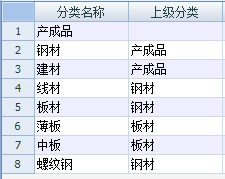 3、例如,我们看“中板”,它的上级分类是“板材”,而“板材”的上级分类是“钢材”,“钢材”的上级分类是“产成品”,“产成品”的上级分类没有,就到顶了。注意其中的关键点是,每条记录的“上级分类”,或者是空,或者是另一条记录的“分类”字段的内容。例如,第5条记录“板材”,它的上级分类是“钢材”,而“钢材”恰巧是另一条记录(第2条)的“分类”字段的内容。这种表达数据层次关系的方式,我们称之为“自我繁殖”,即层次关系通过两个字段表达,一个字段称为关键字段,此例中为“物料分类”,它将确定树型中的一个节点,另一个字段称为“上级关键字”,该字段的内容应该恰巧等于树型中另外一个节点的关键字段内容。